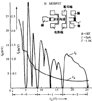 二维电子气系统中的电子在电场与磁场作用下的霍尔效应表现出明显的量子化性质。1980年冯•克利青等人首先从实验中观察到了量子化霍尔效应。他们测量了Si的MOSFET反型层中二维电子气系统中的电子在15T强磁场和低于液氦温度下的霍尔电压Vg沿电流方向的电势差VP与栅压VH的关系。当磁场垂直于反型层,磁感应强度B与沿反型层流动的电流强度I保持不变时,改变栅压Vg,可改变反型层中载流子的密度ns。若