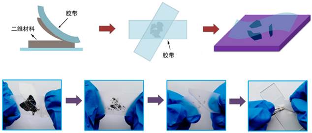 (2)切割一段蓝膜胶带,挑取几颗二维材料单晶黏在胶带上;