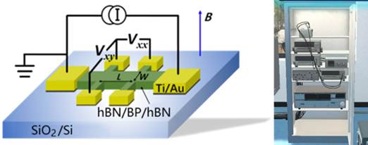 -2.5 V),器件源漏电极间加上17 Hz、100 nA的恒定交流电(根据电阻大小选择合适电流,避免电流热效应),利用锁相放大器测量器件的纵向电压Vxx和横向霍尔电压Vxy,在-9~ 9 T(14T)范围扫描垂直方向磁场,步进为0.01 T(根据测量的曲线精度要求可以自由调整),测得Vxx-B和Vxy-B曲线;