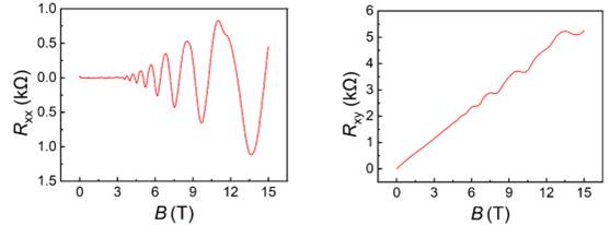 -2.5 V),器件源漏电极间加上17 Hz、100 nA的恒定交流电(根据电阻大小选择合适电流,避免电流热效应),利用锁相放大器测量器件的纵向电压Vxx和横向霍尔电压Vxy,在-9~ 9 T(14T)范围扫描垂直方向磁场,步进为0.01 T(根据测量的曲线精度要求可以自由调整),测得Vxx-B和Vxy-B曲线;